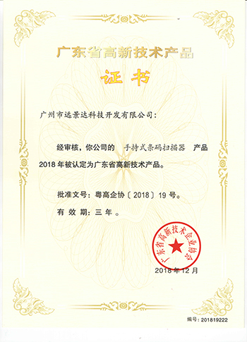 遠景達高新技術(shù)產(chǎn)品證書(手持式條碼掃描器)